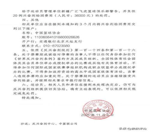 北京时间11月6日,根据中国篮协官方社媒公示,对于上个赛季新疆外援哈雷尔事件开出罚单,禁赛3个月,以及新疆俱乐部承担36000元的检测费用。