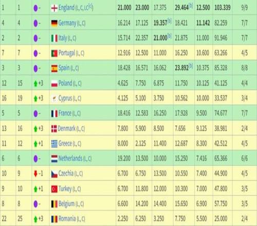 截至北京时间12月11日,25-26赛季至今欧战积分排名已经确定,英超、德甲和意甲分列前三,西甲排名第五法甲仅列第八。