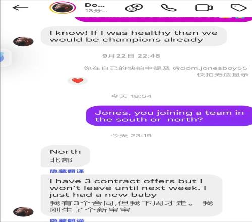 多米尼克琼斯作为CBA老熟人,在社交媒体透露自己下周将会回归CBA联赛,目前手里面有3个合同,而且透露将会加盟CBA北方球队,从现在来看包括新疆男篮、北控男篮均是其潜在下家,对于已经证明自己的琼斯来说,来到CBA赛场将会保住球队下限,对于一支准季后赛级别球队来说,琼斯无疑是一个不错的选择。