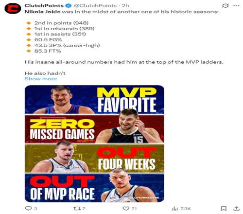 第二方面的打击就是约基奇的出场次数,缺少18场比赛那么约基奇就算之后全勤都只有64场,那么说他要想赶上评奖,他必须提前复出。(约基奇前32场是全勤)