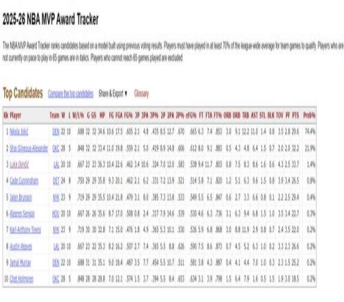 在约基奇对阵热火之前,他的MVP概率高达82.5%,短短一天因为他的膝盖伤势出现,他的MVP已经下滑到74.4%,一天就跌了足足8.1%,随着约基奇的缺席这个概率会持续的下滑,如果掘金战绩下滑,这个概率会下滑的更快。