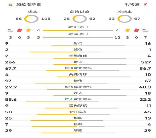 在传球数上,利物浦以527-266明显高出对手;在传球成功率方面,利物浦则以86.7%-67.7%占据着明显优势,其中在关键传球的数据上,利物浦则以10-4占优。在过人方面,利物浦也以18-9占据优势,但过分成功率方面,反倒是加拉塔萨雷以55.6%-22.2%领先。