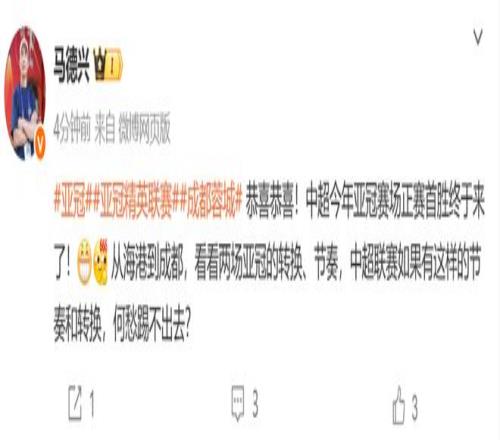相比于首轮三支球队全败的惨状,本轮截至目前中超球队取得1胜1平保持不败。马德兴在社媒上感慨道:“看看两场亚冠的转换、节奏,中超联赛如果有这样的节奏和转换,何愁踢不出去?”