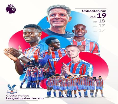 欧协杯第2轮,比赛后段10打11的水晶宫2比0战胜基辅迪那摩,第31分钟穆尼奥斯首开纪录,第58分钟恩凯蒂亚再下一城,博尔纳·索萨第74、76分钟连吃两黄。 水晶宫赢得队史首场欧战胜利,跨赛季连续19场不败,超越1969年18场不败,刷新队史纪录;格拉斯纳的球队也是目前五大联赛连续不败场次最多的,其后是拜仁的9场不败。 水晶宫上一次输球是今年4月16日,客场0比5纽卡斯尔联;本赛季各项赛事11场不败(5胜6平,点球大战算平局),在英超积分榜高居第3位。