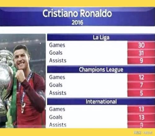 2016年的C罗获得了两个重要团队荣誉:欧冠和欧洲杯冠军。个人赛事出场55次进51球和17个助攻,其中皇马42场38球,葡萄牙国家队13场13球。对于此,妥妥的世界第一,无争议。