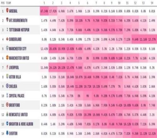 英超前9轮战罢,Opta给出了新一期的超级计算机模拟推演结果。领头羊阿森纳毫无悬念的占据第一热门位置,夺冠概率高达67.34%。而目前落后枪手4分,暂列英超积分榜第二位的伯恩茅斯则仅为1.47%,与暂列积分榜第三的热刺(1.43%)相差无几。本季英超大黑马、暂居第四的升班马桑德兰则没有一次推演结果可以夺冠,概率为0%。依照该推演结果,最有希望与阿森纳争冠的球队依然是目前排名第5的曼城(12.43%)和第7的利物浦(11.04%)