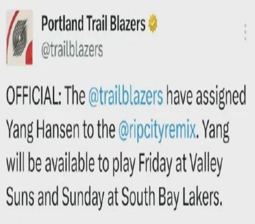 开拓者宣布再次下放杨瀚森到G联赛混音队,这次不仅训练,还会完成NBA发展联盟首秀。