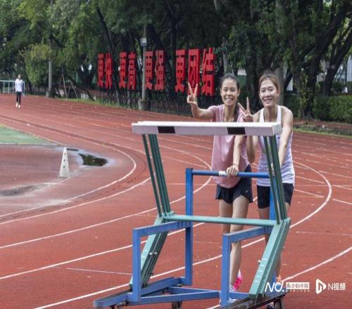训练结束,在田径场跑道中间的草地上散步调整,莫家蝶与队友曾蕊应记者的要求合照,笑得开怀。