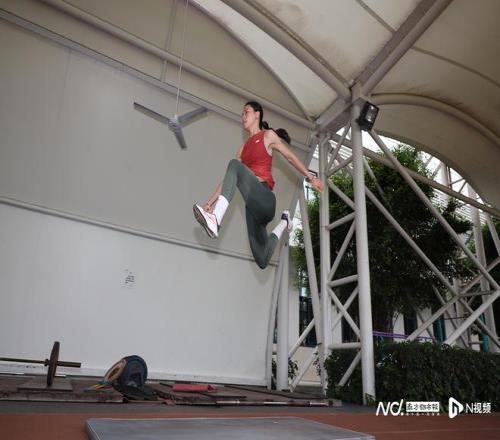 在训练场器械区,莫家蝶进行自我训练,跳起来腾空相当高。