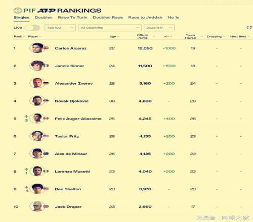 我们再来关注世界积分排名榜。在ATP年终总决赛结束之后,年终的世界排名也尘埃落定。阿尔卡拉斯以12050分居于榜首,辛纳以11500分紧随其后。排在第三位的小兹维列夫,积分是5160,还不到TOP2的一半。排在第四到第十位的分别是德约科维奇(4830分)、阿利亚西姆(4245)、弗里茨(4135)、德米纳尔(4135)、穆塞蒂(4040)、谢尔顿(3970)、德雷珀(2990)。