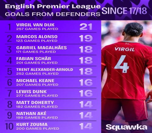 北京时间11月19日,知名数据机构Squawka统计了自2017-18赛季以来英超联赛的后卫进球榜,范戴克21球排名第一,马科斯-阿隆索19球第二,加布里埃尔、法比安-舍尔以及亚历山大-阿诺德18球并列第三。