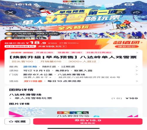 以滑雪热门地河北张家口为例,近几年当地滑雪场数量大幅扩容,竞争愈发激烈,多家雪场纷纷下调价格,百元内就能拿下门票,和此前两三百元的定价形成鲜明对比。一些其他雪场甚至在团购平台上推出19.9 元、29.9元的超低价雪票,堪称“白菜价”体验。