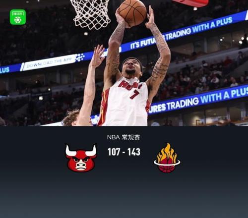 第四节,公牛基迪领衔替补继续在账,热火也主力在场持续拉大分差接连40分,直至后半节热火换下主力,公牛基迪仍在场带队但无济于事,全场结束,热火143-107公牛。