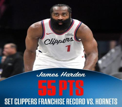 北京时间11月23日,詹姆斯·哈登在对阵夏洛特黄蜂的比赛中命中平生涯纪录的10记三分,砍下55分,帮助快艇以131比116取胜。55分刷新了快艇队史单场得分纪录,这也是哈登17年职业生涯里砍下的第25场50+,追平科比并列历史第三。此前快艇的得分纪录是由查尔斯·史密斯和鲍勃·麦卡杜保持的52分。