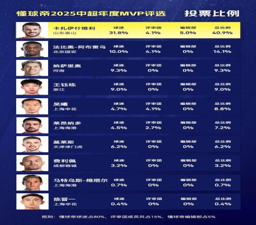 2025赛季懂球帝中超最佳球员揭晓,经过球迷投票(占比80%)、评审团投票(占比15%)、编辑部投票(占比5%),山东泰山外援卡扎伊什维利以40.9%的得票率当选2025赛季懂球帝中超MVP!
