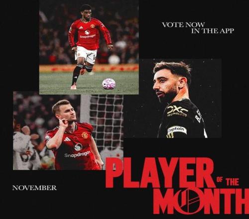 北京时间12月2日,曼联官方公布11月队内最佳球员候选名单,这3名球员为布鲁诺-费尔南德斯、阿马德、德利赫特。在11月曼联的战绩为1胜2平1负。