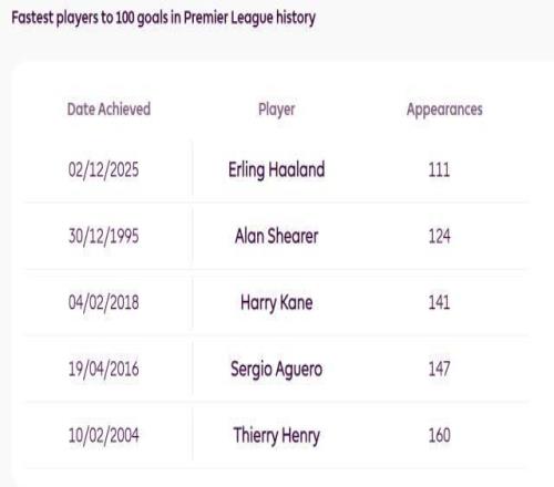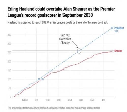 有统计机构测算,照这个速度,再过不到5年时间,哈兰德就将于2030年9月,在30岁年纪,超越希勒的260球,成为英超历史射手王。英超官方的测算结果慢一些,要等到2031年3月或4月。