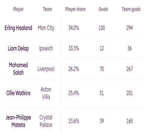 ⑤哈兰德加盟以来,曼城在英超一共打进294球,哈兰德贡献了其中34%,这个占比为同期英超之最,只有德拉普在伊普斯维奇的贡献与此接近,萨拉赫在利物浦总进球中的占比“只有”26.2%。