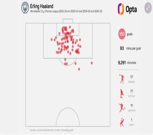 ⑥哈兰德100球中,左脚打进71球,右脚11球,头球17个,另在2023年4比4切尔西一役用裆部怼进1球。至于进球地点,94球在禁区内,6球来自禁区外,表明哈兰德远射能力不算差。
