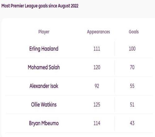①2022年登陆英超以来,哈兰德进了100球,同期离他最近的萨拉赫只有70球,伊萨克55球就差得更远。
