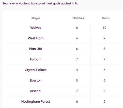 ②哈兰德对遇到过的全部英超球队都进过球,累计23支球队。狼队是他的最爱,6次碰面戳了10个窟窿。豪门中,曼联对魔童最慷慨,6次交手被他打进8个。
