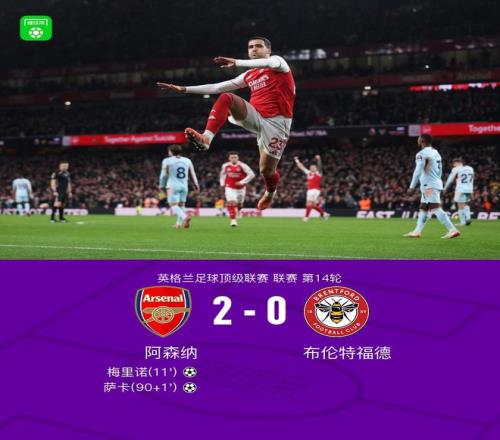 北京时间12月4日,英格兰足球超级联赛第14轮,阿森纳坐镇主场迎战布伦特福德。比赛中,本-怀特送出精准助攻,梅里诺接球后冷静施射破门,为阿森纳先拔头筹。下半场补时阶段,梅里诺展现个人能力,突破后传中找到萨卡,后者把握机会推射得手,将比分扩大。凭借这两粒进球,阿森纳以2比0战胜对手,全取三分。