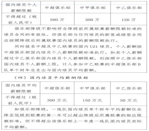 国内球员(含港澳台球员)平均薪酬限额分别为:中超不超过税前300万人民币、中甲不超过税前150万人民币、中乙不超过税前50万人民币。