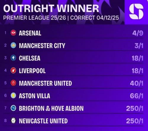 《转会市场》统计了2025年英超总积分情况,阿森纳多赛1场力压曼城居首的。