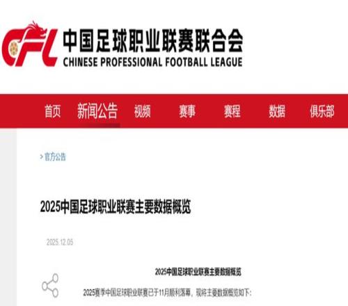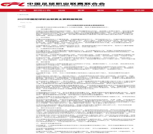 中足联发布《2025中国足球职业联赛主要数据概览》,主要数据如下(详见文末截图或点击文末阅读原文)