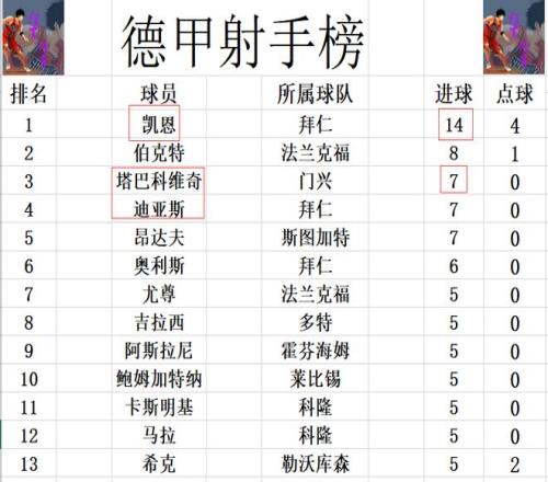 射手榜方面,前十没有任何变化,凯恩14球高居榜首,伯克特8球位列第2。塔巴科维奇今天没有进球,还是和迪亚斯,昂达夫7球并列第3。吉拉西,西克,鲍姆加特纳,尤尊等人5球刚好挤入前十。