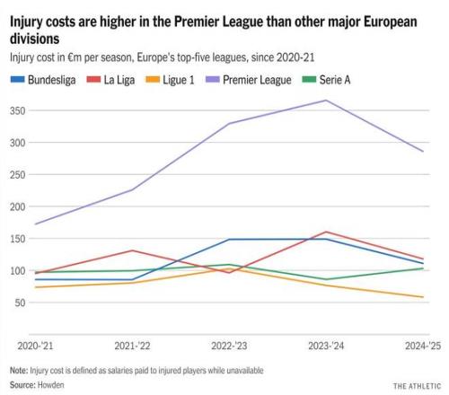总计过去五个赛季,欧洲五大联赛的伤病“成本”总额接近30亿英镑(他们假设俱乐部向受伤球员全额支付工资),其中40%来自英超球员
