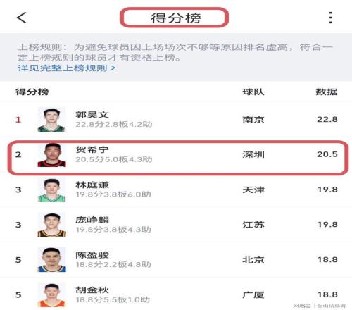 上场时间联盟第一,让我们不妨看看贺希宁的场上数据。截止常规赛前6轮,贺西宁场均得分20.5分,还有5个篮板4.5次助攻进账。三项数据均创造了职业生涯新高。打青岛队,他砍下24分6篮板2助攻;打吉林队,他砍下11分5篮板1助攻;打宁波队,他砍下15分3篮板3助攻;打北京队,他砍下27分5篮板4助攻;打山东队,他砍下25分3篮板4助攻;打四川队,他砍下21分8篮板12助攻的准三双。而贺西宁场均20.5分,也排在本土球员第2位。