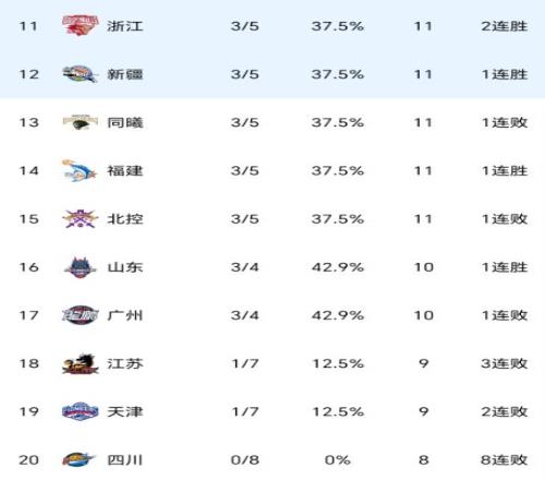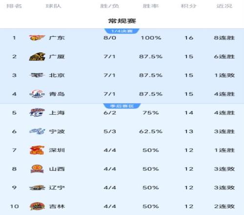随着广东8轮全胜,广厦送北京首败,CBA最新积分榜有变:榜首易主