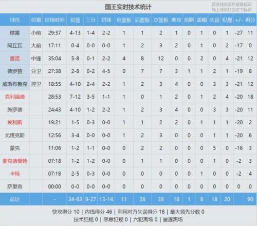 半场战罢,快船73-40领先国王33分。国王全队8次失误,快船只有1次失误。伦纳德13投8中,砍下26分3篮板3助攻1抢断,正负值+26。哈登半场9中5,拿到16分2篮板2助攻1抢断。大洛今天彻底失准,上半场3中0没能得分。