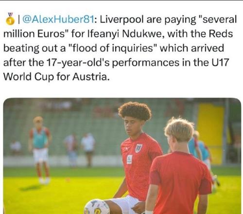 名记通稿:利物浦将在夏天签下奥地利17岁中卫Ifeanyi Ndukwe,后者是带领奥地利杀入U17世界杯决赛的主力中卫。利物浦在雪片似的报价中胜出,为此将付出几百万欧元。