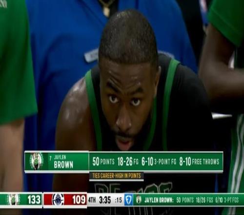 他在末节3分44秒就被换下,否则打破生涯得分纪录轻而易举。当然我有种预感,50分可能还不是他这赛季的最高分,杰伦-布朗最近的状态太火热了。