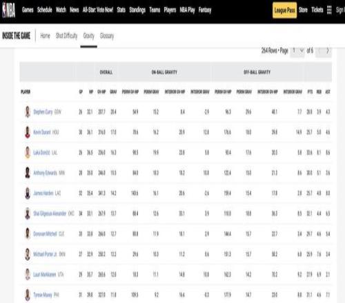 “库有引力”库里高居联盟第一!NBA官方公布本赛季至今引力值(量化了球员吸引防守者注意力与场上空间预测之间的差异程度)Top10名单,其中火箭队杜兰特第2,快船队哈登第5。