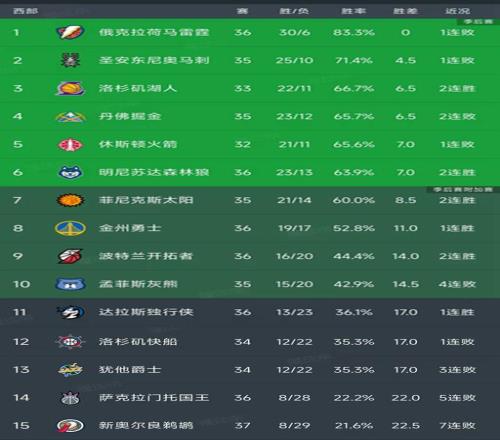 北京时间1月5日,今日的NBA常规赛又结束了8场较量,我们看看西部的战况,雷霆被太阳三分绝杀,湖人逆转灰熊升第三名,残阵掘金连败,森林狼轻取东部弱旅奇才,国王和鹈鹕难逃连败命运处于西部最后两名!