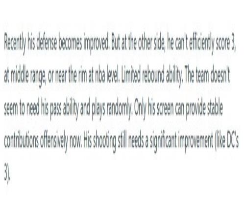 他的防守表现近来已有明显进步,但在进攻端,以NBA的水准来看,无论是三分投射、中距离得分还是篮下终结,他的效率都十分低下。篮板能力同样受限,球队似乎并不需要他的传球组织能力,他在场上的处理球也显得比较随意。如今在进攻端,他唯一能稳定为球队贡献的,就只有掩护质量。他的投篮能力仍需大幅提升——比如像克林根那样的进步。