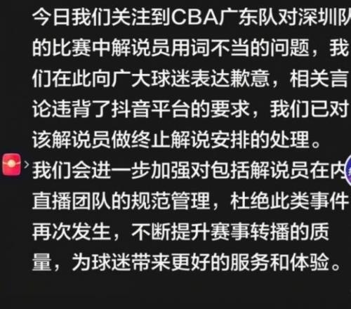 1月8日,目前CBA常规赛正火热进行中,多场精彩比赛上演。然而这时候却出现不和谐的一幕,在昨晚广东队和深圳队的比赛中,某音平台解说的一番言论引起轩然大波,对球迷极尽嘲讽。