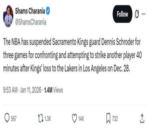 11日早ESPN名记Shams突然在社媒放出重磅消息,曝出国王后卫施罗德被禁赛3场,原因是在12月29日湖人对阵国王赛后40分钟,施罗德与湖人一名球员发生冲突,并试图殴打对方。