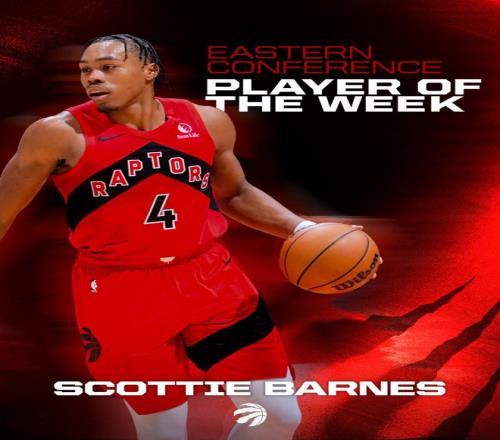 猛龙队上周同样打出3胜1负的表现,巴恩斯场均得到22分、6.3个篮板和6.0次助攻,他出战了其中获胜的3场比赛。