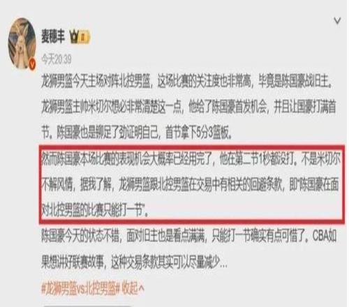 昨天晚上的比赛,广州龙狮队在主场以104-75大胜北控男篮,结束了球队的3连败。这场比赛广州龙狮队的内线球员陈国豪只打了第一节的10分钟,5投2中拿到5分3篮板的数据,之后的3节比赛他一直在场边坐着看球,再也没有上场。于是就有球迷开始讨论CBA是否存在回避条款呢?不仅是陈国豪,还有周琦和赵睿等球员此前也有类似的情况。