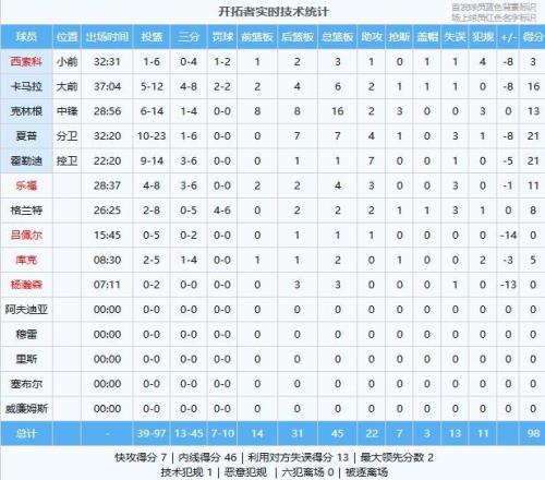 马穆凯拉什维利22分6板4助、奎克利20分8板7助2断、英格拉姆20分7板3助2断、巴恩斯15分9板4助6帽、巴雷特10分6板3助、阿巴基10分4板1助、迪克10分2板1助