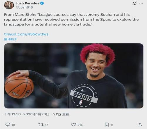 据NBA名记Marc Stein报道,马刺前锋杰里米-索汉和他的经纪团队已经获得马刺许可,经纪团队将为索汉寻找新东家以促成交易。现在距离交易截止日仅剩一周,时间并不充裕,索汉能否成功找到下家,就看经纪团队的能力了。
