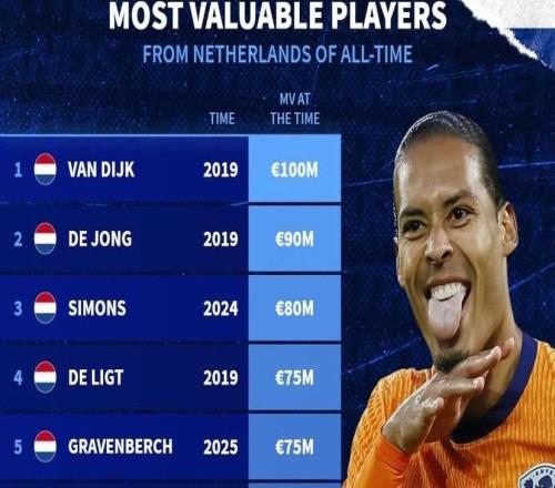 北京时间10月13日,德转统计出了荷兰球员历史身价榜,2019年身价曾经达到1亿欧元的范戴克排名第一,弗朗基-德容9000万欧元排名第二,哈维-西蒙斯8000万欧元第三。德转统计荷兰球员