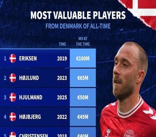 北京时间10月13日,德转统计出了丹麦球员历史身价榜,2019年身价曾经达到1亿欧元的埃里克森高居第一,霍伊伦排名第二,尤尔曼德第三,赫伊别尔与克里斯滕森也都榜上有名。德转统计丹